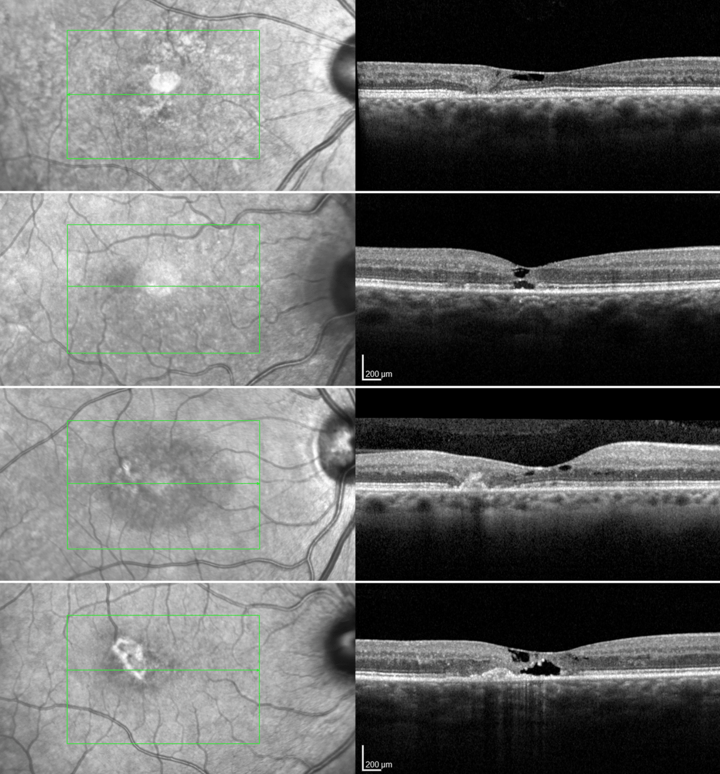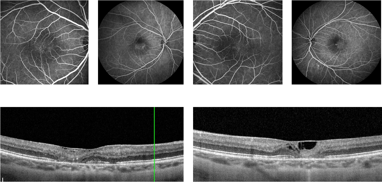 - OCT findings of out retinal cavitation and an area of ellipsoid zone loss